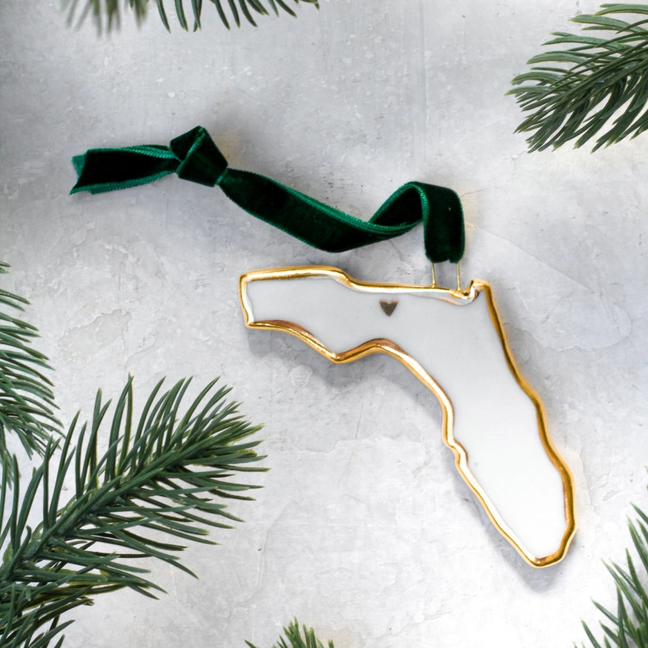 Celebrate your state pride with these beautiful porcelain ornaments, each handmade in the shape of a beloved U.S. state. Outlined in luxurious 22k gold luster, these ornaments capture the elegance and charm of the season, making them perfect for holiday decorating or year-round display. Each ornament features a delicately placed gold heart on the capitol. The ornaments are suspended from a velvet green ribbon. Whether you're celebrating your home state or gifting a piece of someone's personal history, these state-shaped ornaments are a beautiful way to honor the places that mean the most.