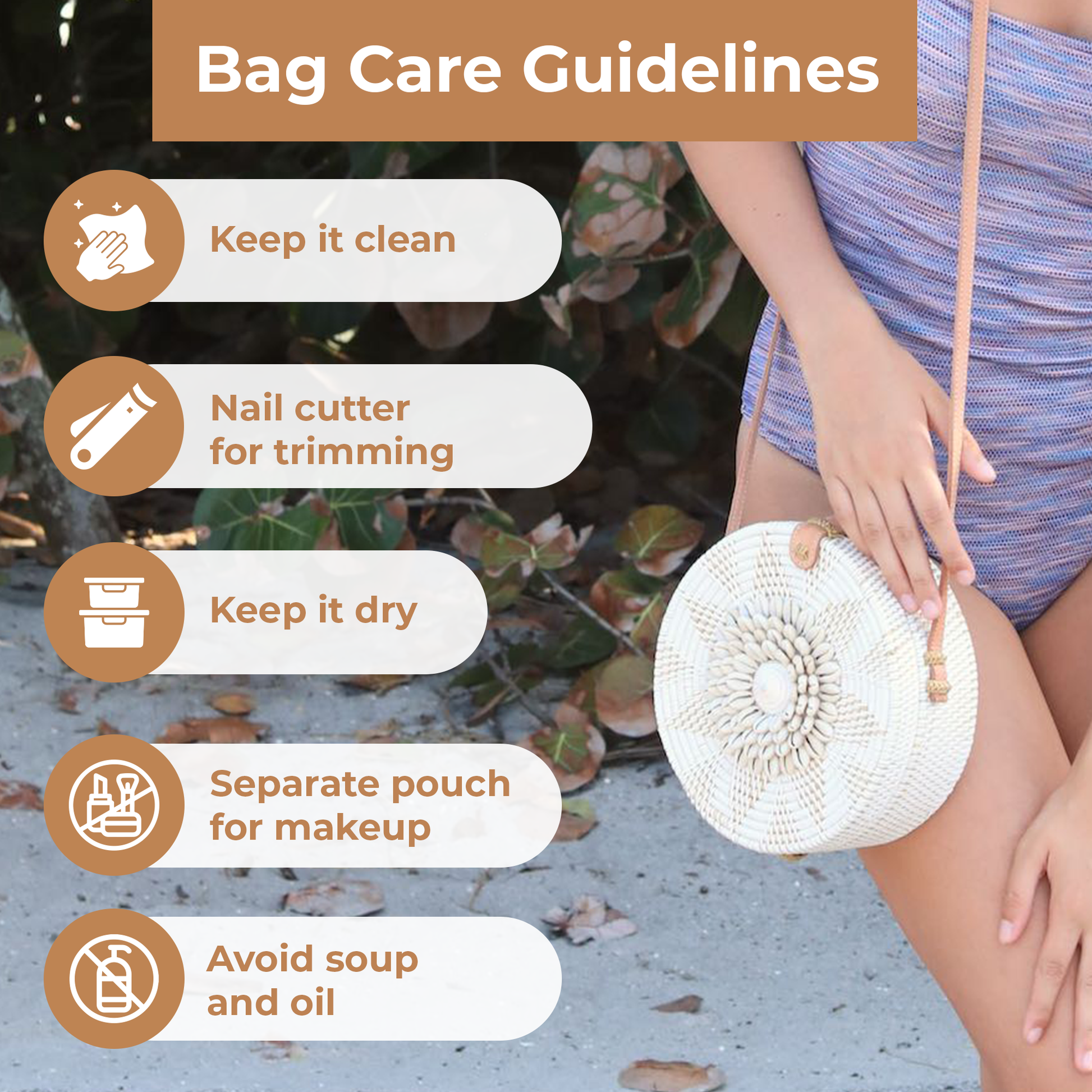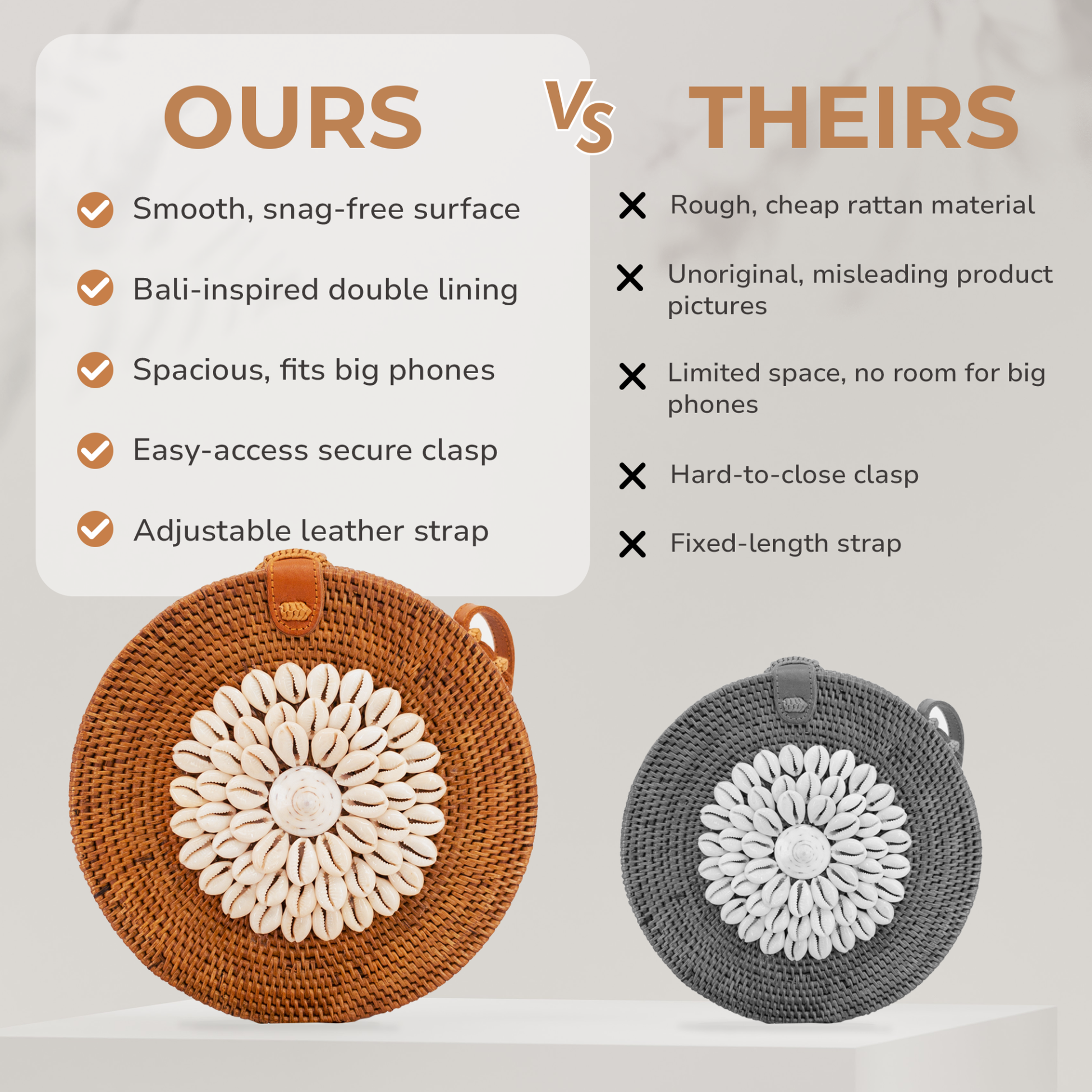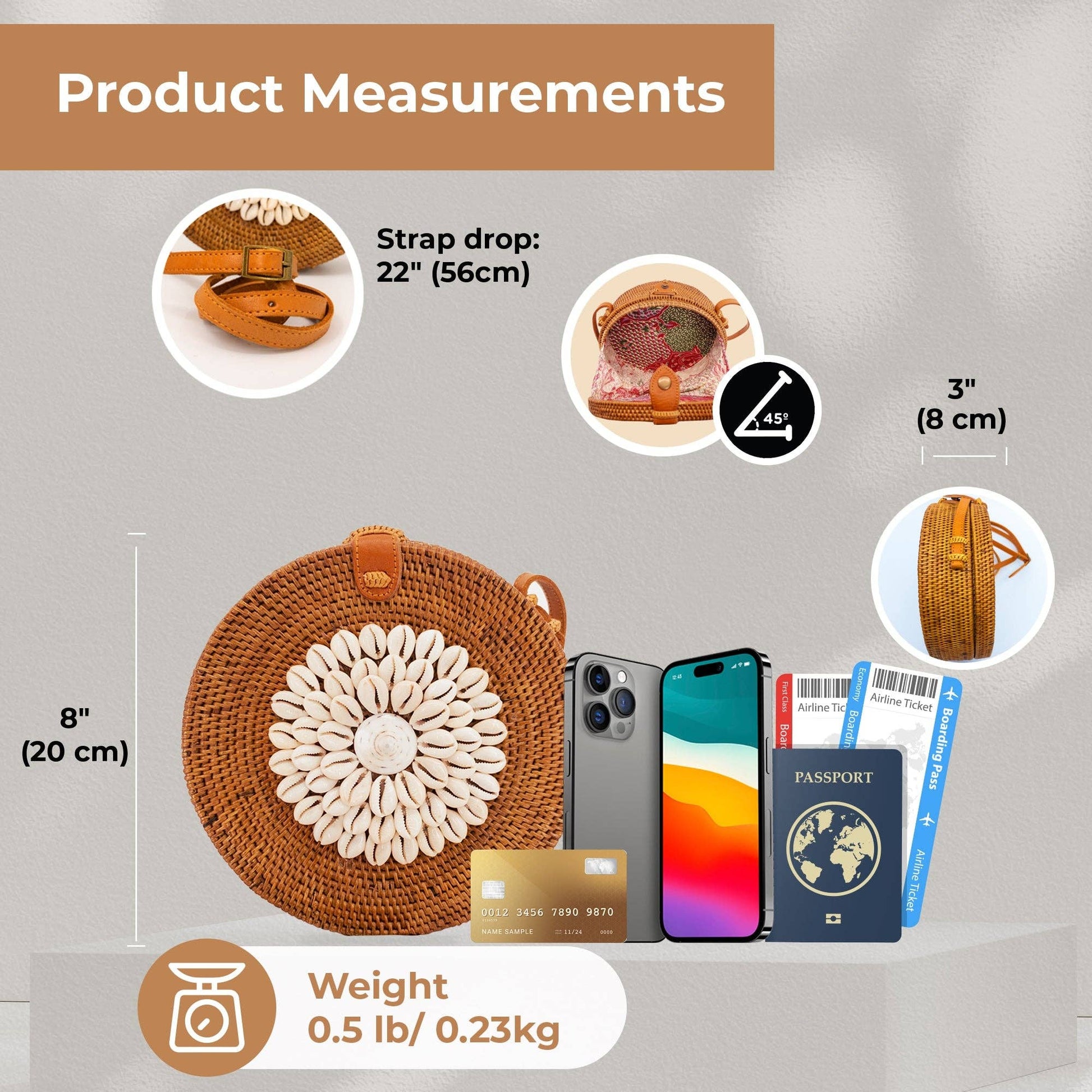 Introducing our Bali Round Rattan Crossbody Bag with Seashell Embellishment and Adjustable Strap! This stunning bag is handcrafted from natural rattan and features a beautiful array of carefully selected seashells that are individually placed by hand. The adjustable strap allows you to customize the fit to your liking, making it the perfect accessory for any occasion. The circular design of the bag adds a touch of bohemian elegance, and the seashell embellishments bring a touch of natural beauty to your outfit. Whether you're headed to the beach or out for a night on the town, our Bali Round Rattan Crossbody Bag is sure to turn heads and elevate your style.