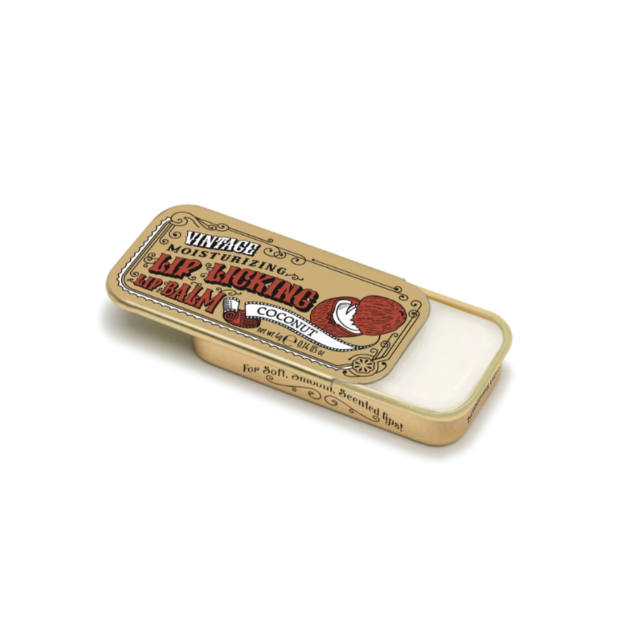 Coconut Lip Licking Flavored Lip Balm This Lip Licking flavored lip balm for Soft, Smooth Scented Lips brings back sweet memories! Our flavored lip balm formula is NOW organic & natural Slide back the lid of this gold vintage slider tin to find the delicious scent of sweet, rich Coconut housed inside. Our Lip Licking Flavored Lip Balm is slightly tinted but once applied it appears clear. .23 fl oz /6 g/ml