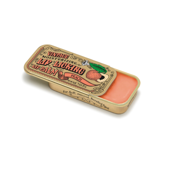 This Lip Licking flavored lip balm for Soft, Smooth Scented Lips brings back sweet memories! Our flavored lip balm formula is NOW organic & natural made with only the finest, top of the line ingredients & proudly MADE in the USA Slide back the lid of this gold vintage slider tin to find the delicious scent of sweet Peach & a hint of vanilla housed inside. Our Lip Licking Flavored Lip Balm is slightly tinted but once applied it appears clear. Our flavored lip licking lip balms are Petrolatum free, Paraben free, Phthalate free, Gluten free & always Cruelty free .23 fl oz /6 g/ml