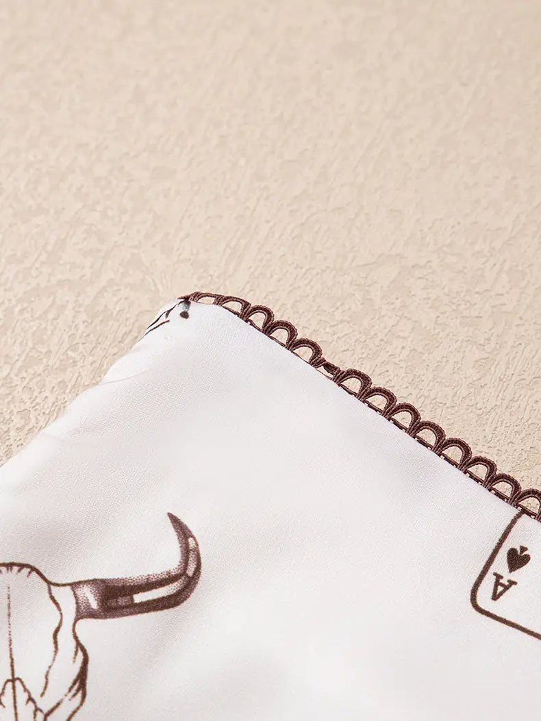 This playful satin maxi skirt blends 97% polyester with 3% spandex for a soft, stretchy fit that moves with you. Featuring a unique western cowgirl print and stylish brown details, it’s perfect for adding a fun twist to your wardrobe.